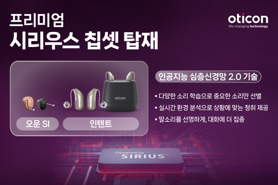글로벌 청각 전문기업 오티콘은 지난해 공개된 오픈형 보청기 ‘오티콘 인텐트’에 이어 동일한 시리우스 칩셋을 귓속형 라인업까지 확장하게 됐다고 22일 밝혔다.